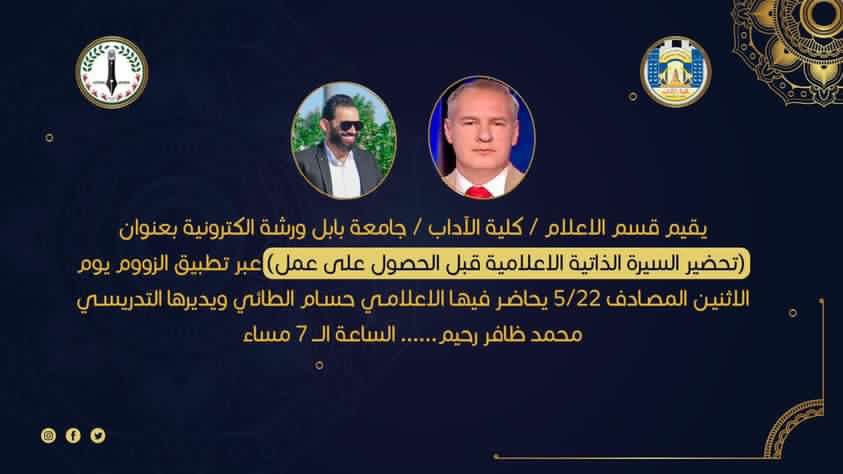 بالتعاون مع جامعة بابل كلية الادب قسم الاعلام اقمت بالتعاون مع الاستاذ محمد ظافر ورشة تحضير السيرة الذاتية الاعلامية قبل الحصول على عمل لطلبة قسم الاعلام.