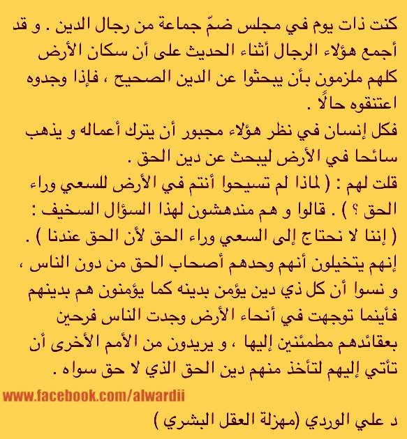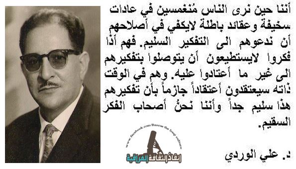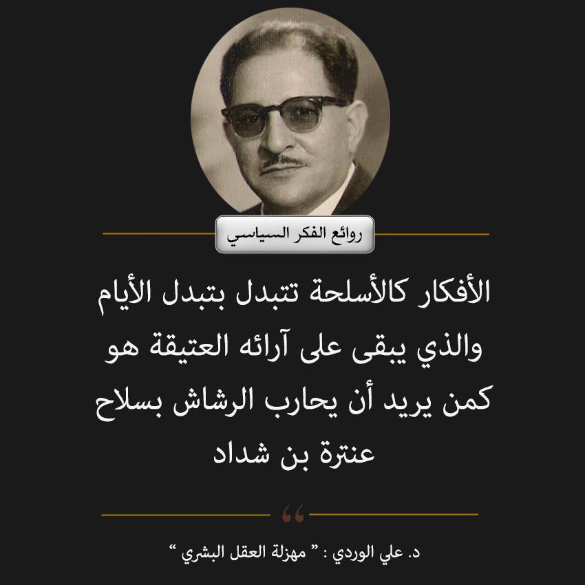 روائع مؤسس علم الاجتماع “علي الوردي” الذي ازالة القناع الوردي عن المجتمع ليظهر اللون الداكن Posted by husamaltaee on 2014/01/21 Posted in: مواضيع اعلامية. Tagged: علي#الوردي#علم#اجتماع#عراق#مؤسس#عالم. أضف تعليق علي محسن عبد الجليل الوردي عالم اجتماع استاذ مؤرخ مؤسس عملم الاجتماع العراقي الرجل العلماني الموضوعي في طرحه ومواضيعة. هذا الرجل الرائع الذي حمل بكلوريوس من الجامعة الامريكية في بيروت والماجستير والدكتوراة من جامعة تكساس في امريكا هذا الرجل الذي قال له رئيس جامعة تكساس عند تقديم الشهادة له: (أيها الدكتور الوردي ستكون الأول في مستقبل علم الاجتماع)، كان اول من ابعد الخيالات الوردية عن مجتمعنا ليظهر اللون الاخر اللون الداكن المخفي، كان اول من كشف عيوب المجتمع ومشاكلة وازماتة التي اخفيت لاعوام بسبب العادات والتقاليد وثقافة العيب والخوف من الاخر، لطالما كان محاربا في مسيرتة من المجتمع الذي يتصور انة وردي ولايعرف مايحمل من لون اسود داكن قابع في نفسة ورغم هذا ظل يحقق المستحيل ويسير عكس التيار الى ان اصبح علم من اعلام العراق وعلم الاجتماع. وبعد هذه المسيرة من الرائع ان انشر لهذا الرجل العظيم شيء بسيط من بحر علمة الواسع الذي اغرقنا به شارك هذا الموضوع: شارك على فيسبوك (فتح في نافذة جديدة) فيس بوك المشاركة على X (فتح في نافذة جديدة) X مشاركة على واتساب (فتح في نافذة جديدة) WhatsApp مشاركة على تيليجرام (فتح في نافذة جديدة) Telegram Share on LinkedIn (فتح في نافذة جديدة) LinkedIn اطبع (فتح في نافذة جديدة) طباعة Email a link to a friend (فتح في نافذة جديدة) البريد الإلكتروني إعجاب تحميل... مرتبط تصفّح المقالات ← سعي الولايات المتحدة الامريكية للسطيرة على مراكز الارسال والهوائيات في العالم مضيعات الوقت →