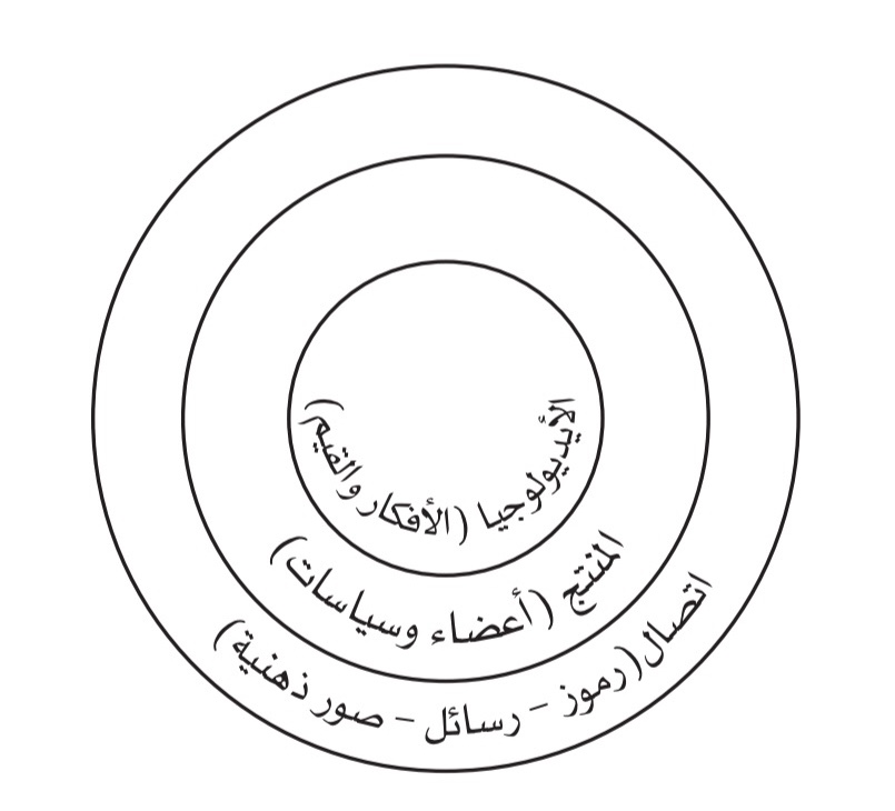 نلحظ في هذا الشكل أن الحزب السياسي يقوم ابتداء على أيديولوجيا تسبق التكوين الإداري والبرامج الحزبية والاتصال بالمجتمع. بل إن أهـداف الحزب وبرامجه إنما تخدم في غايتها الأيديولوجيا التي يتبناها المنتمون للحزب. أعضاء الحزب (الذين يمثلون الدائرة الثانية في الشكل) هم الذين يجسدون قيم الأيديولوجيا التي يؤمنون بها، ويظهر ذلك من النشاط الإداري أو السياسي الذي يعكس حقيقة الانتماء للأيديولوجيا. أما وسائل الاتصال ( الدائرة الثالثة في الشكل) فتمثل الحلقة الأكبر التي تربط أيديولوجيا الحزب وأعضاءه بالمجتمع من خلال الرموز الأيديولوجية والسياسية التي يروج لها الحزب، والرسائل الاتصالية التي تحمل الأفكار والقيم الرئيسة له، ومن ثم الصور الذهنية التي تتشكل من ذلك كله وتبقى راسخة في عقلية الجماهير