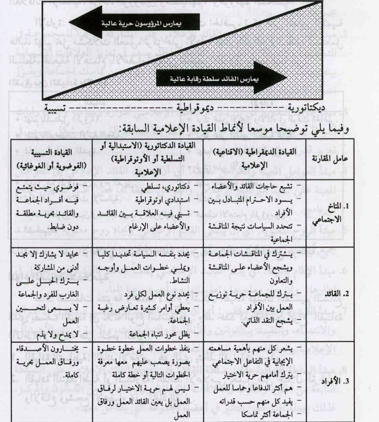 3. القيادة غير الموجهة أو الفوضوية: القائد الإعلامي يتنازل عن سلطة اتخاذ القرار ويصبح في حكم مستشار الجماعة، فهولا يسيطر على الأعضاء بطريقة مباشرة، ولا يحاول أن يؤثر عليهم بطريقة غير مباشرة، وهذا أسلوب غير عملي للقيادة حيث يشجع على التهرب من المسؤولية.