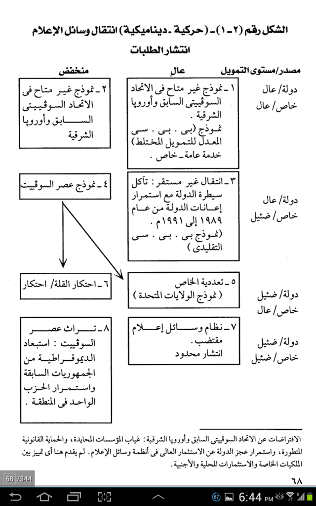 يبدو أن الأنظمة الإعلامية فى هذه المنطقة سوف تحتاج، لبعض الوقت إلى الاعتماد على الاستثمارات الخاصة المحلية والأجنبية. وبدون هذه الأموال، سوف تواجه وجودًا غير مستقر قيوده شديده. ولذلك الغرض، هناك تصوران غير متاحين لهذا التحول. الأول مساندة كبيرة من قبل الدولة مع مساندة كبيرة أيضًا من القطاع الخاص ((المستطيل رقم (١) والمستطيل رقم (٢))). المستطيلات من رقم (٣) إلى رقم (٨) هى فقط التى تلائم نقاشنا :