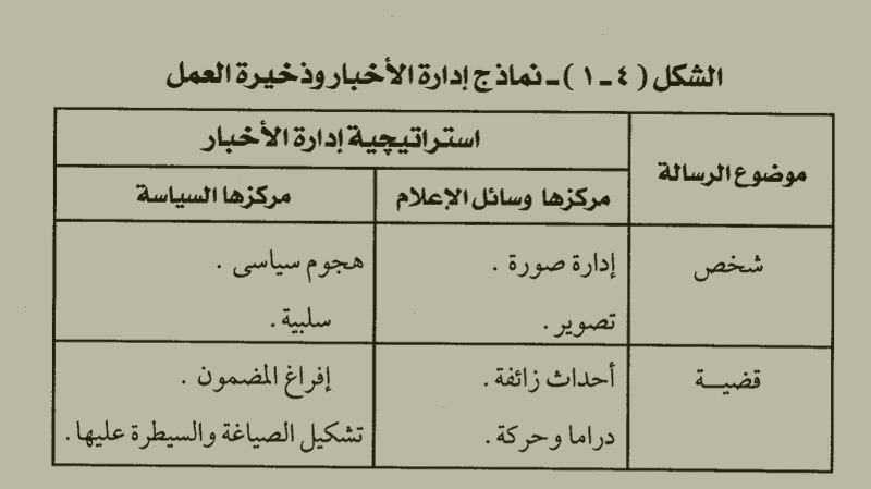 إذا فحصنا ذخيرة العمل هذه طبقًا للبعدين اللذين وضعناهما لإدارة الأخبار (استراتيجية إدارة الأخبار، وموضوع الرسالة )، سوف يمكننا تصنيف هذه السلوكيات فى مجالها الاستراتيجى ( انظر الشكل ١ – ٤ ) . الاستراتيجية التى مركزها وسائل الإعلام التى تركز على أفراد الحكومة، تؤكد على تشخيص السياسة والزعامة . هذه التقنية تعتمد على الشكل المرئى للإعلام. تصوير الناس أسهل كثيرا من تصوير اقتراحات السياسة المعقدة . علاوة على ذلك، استغلال السمات الشخصية يُشبع تصوير اهتمام الإنسان من تغطية الأخبار . كثيرًا ما تقوم مثل هذه الاستراتيجية بتصوير رئيس الحكومة كنجم سياسى، وإظهار السياسة كمباراة بين الأفراد بدلاً من منافسة سياسية .